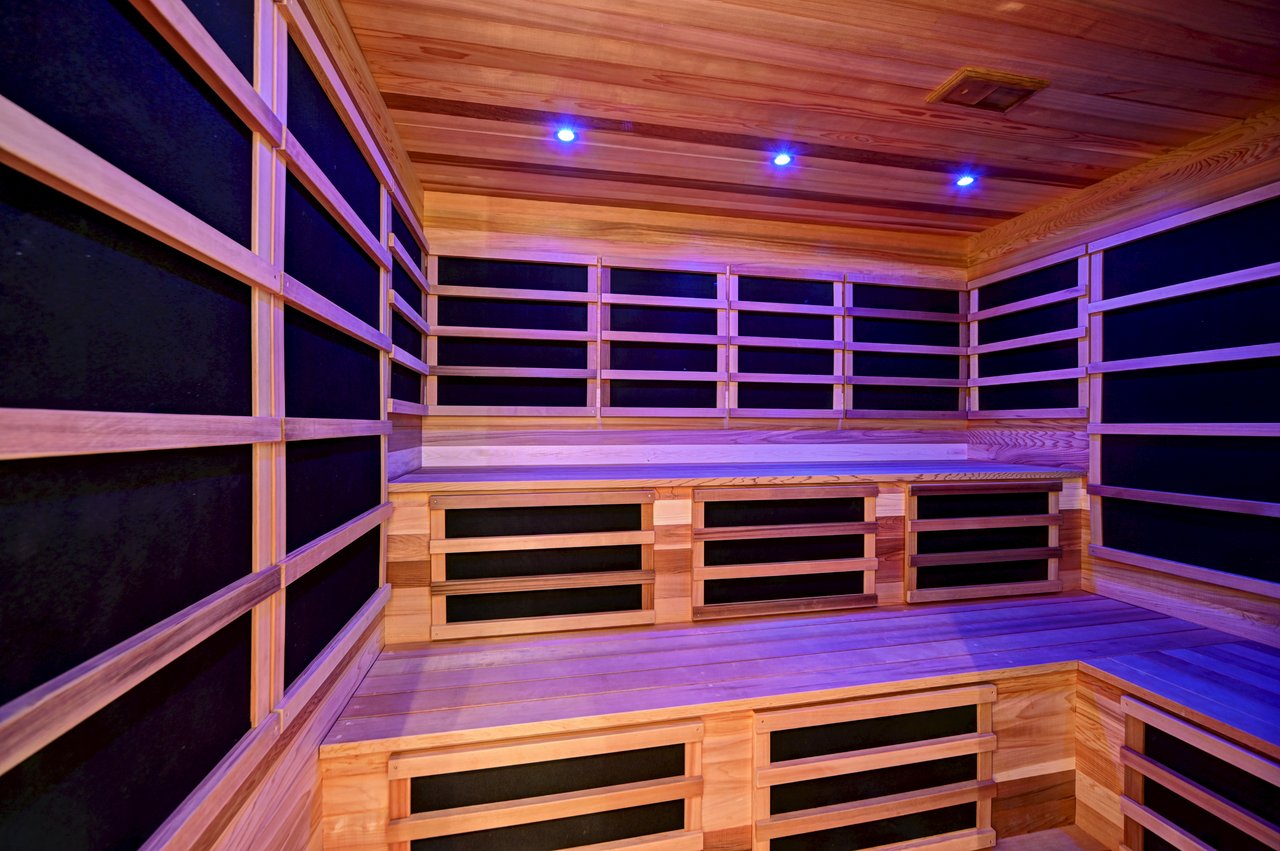 Additional amenities include a gym, wine room, sauna, cedar closets, heated two and a half-car garage, Lutron lighting, custom architectural LED systems, and comprehensive interior and exterior audio.