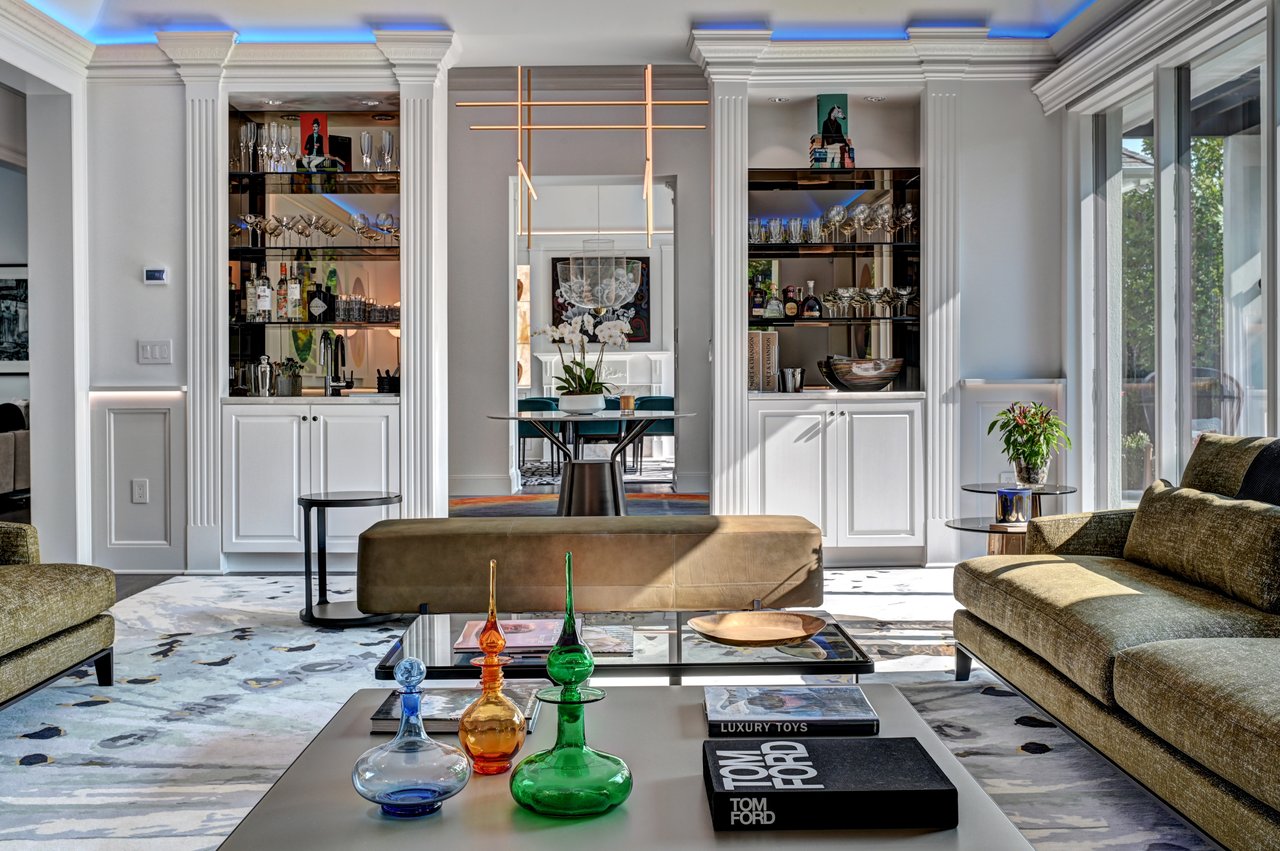 • The kitchen features bespoke Poliform/Varenna cabinetry, Wolf and Miele appliances, a butler’s pantry, and an adjacent lounge designed for informal gathering.