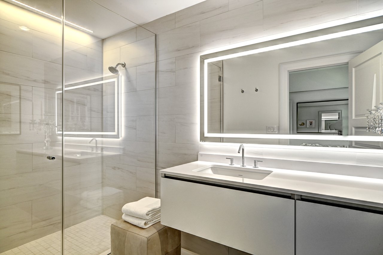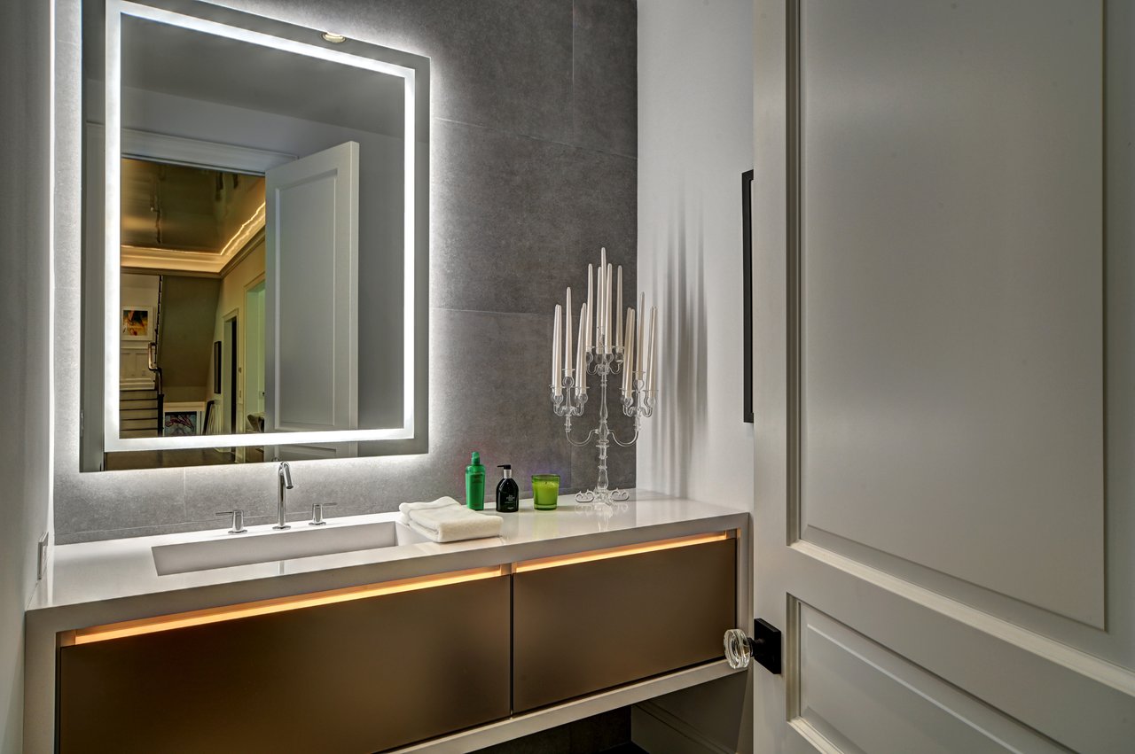 • The dining room is anchored by illuminated Italian stone wall panels and floating glass shelving, enhanced by refined custom detailing.