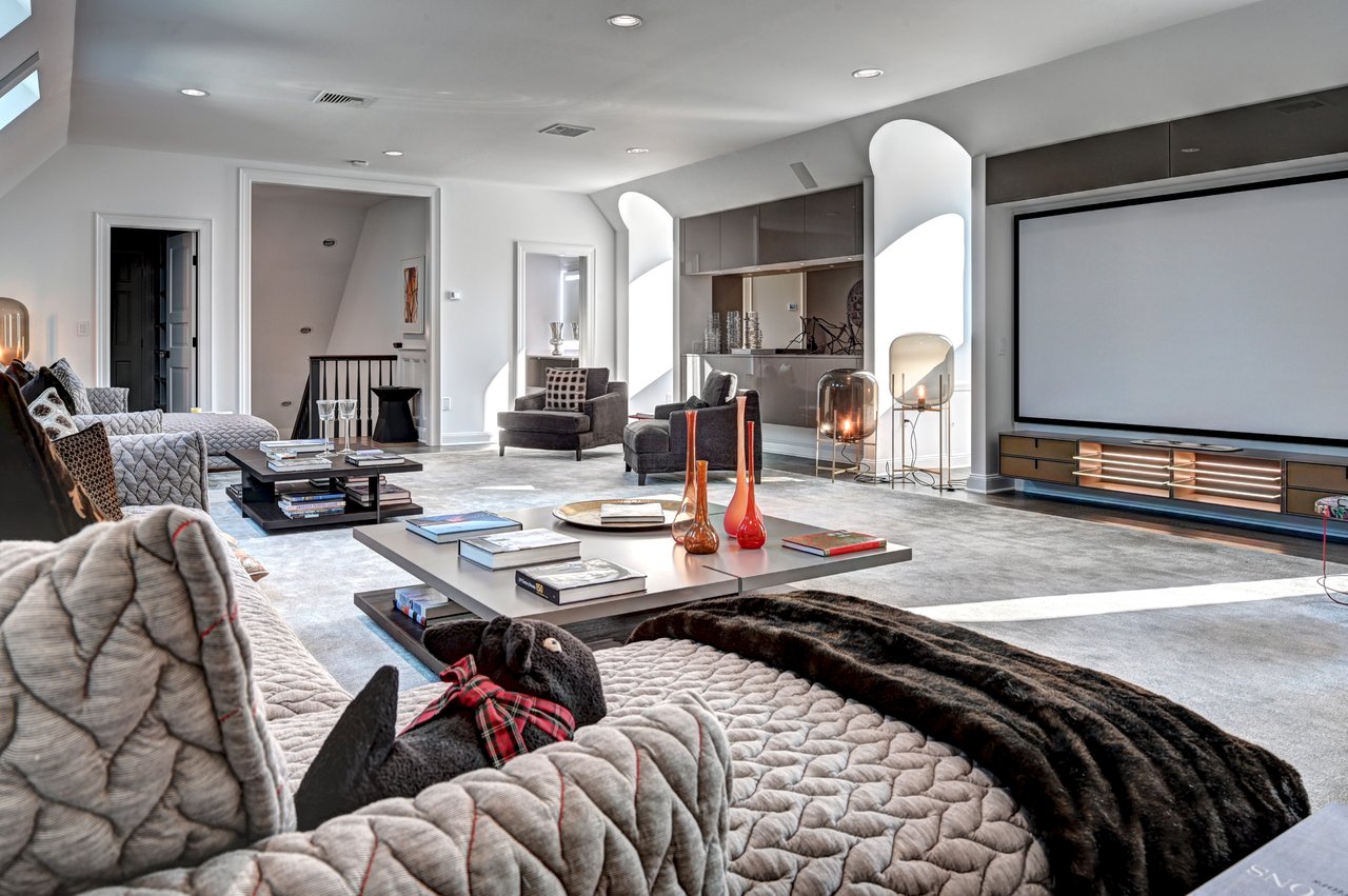 Upstairs, an expansive media room exceeding 30 feet includes a projection theater, wet bar, full bath, and motorized blackout shades—ideal for relaxed evenings or private screenings.