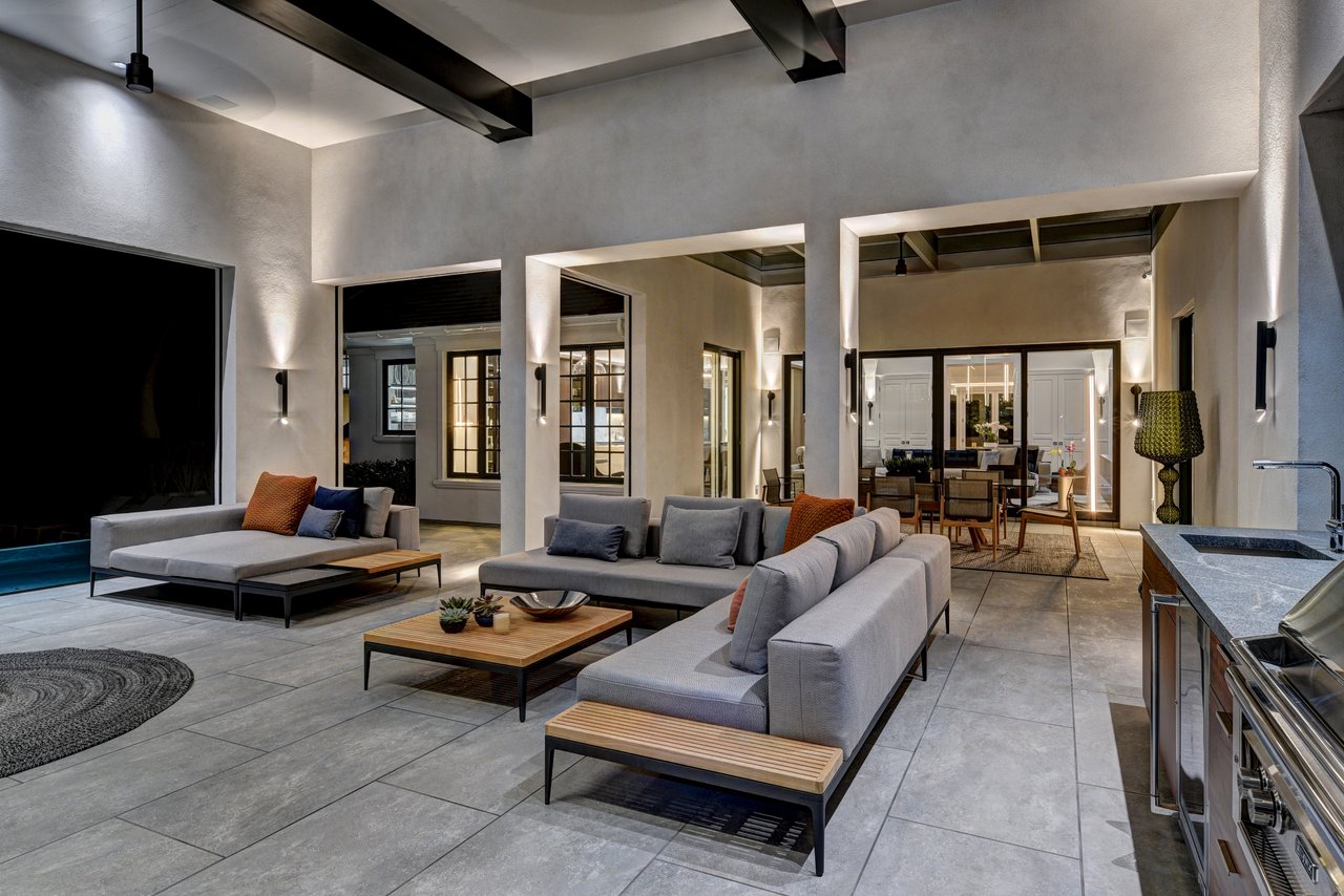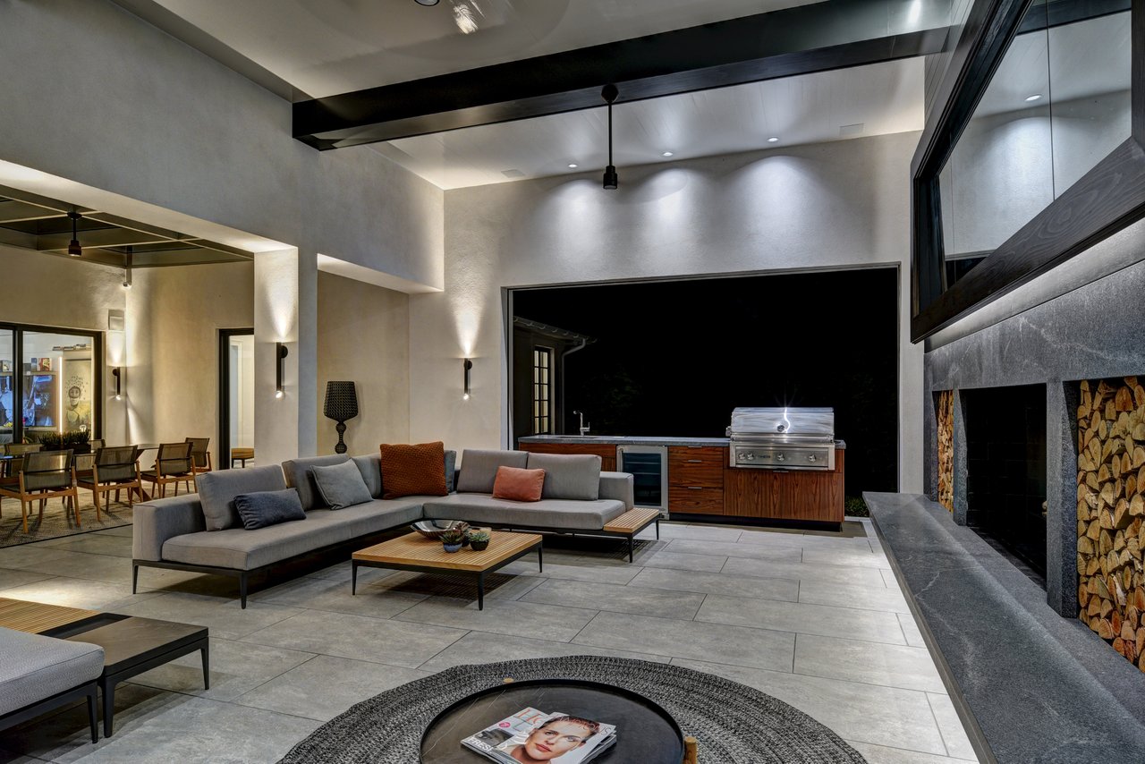 • The primary outdoor living pavilion features 14-foot ceilings, a custom summer kitchen, wood-burning fireplace, and a dramatic infinity edge heated salt water spa. Motorized retractable screens allow effortless transition between open air and enclosed comfort.