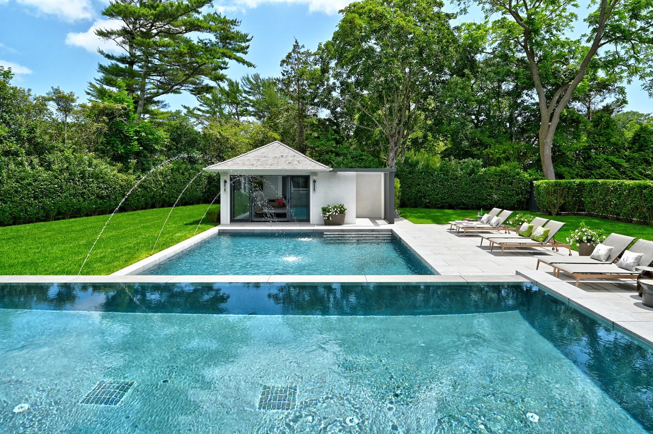 • The pool pavilion includes a full bath, outdoor shower, and a generously scaled, heated gunite pool, set to the sound of ocean waves carrying on summer evenings.