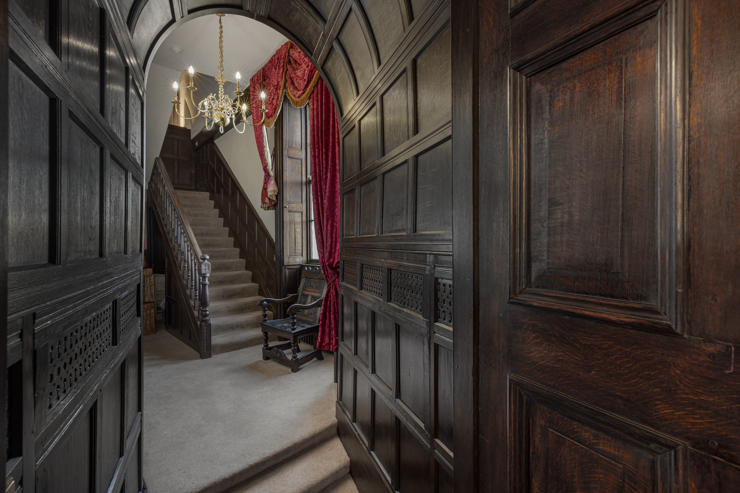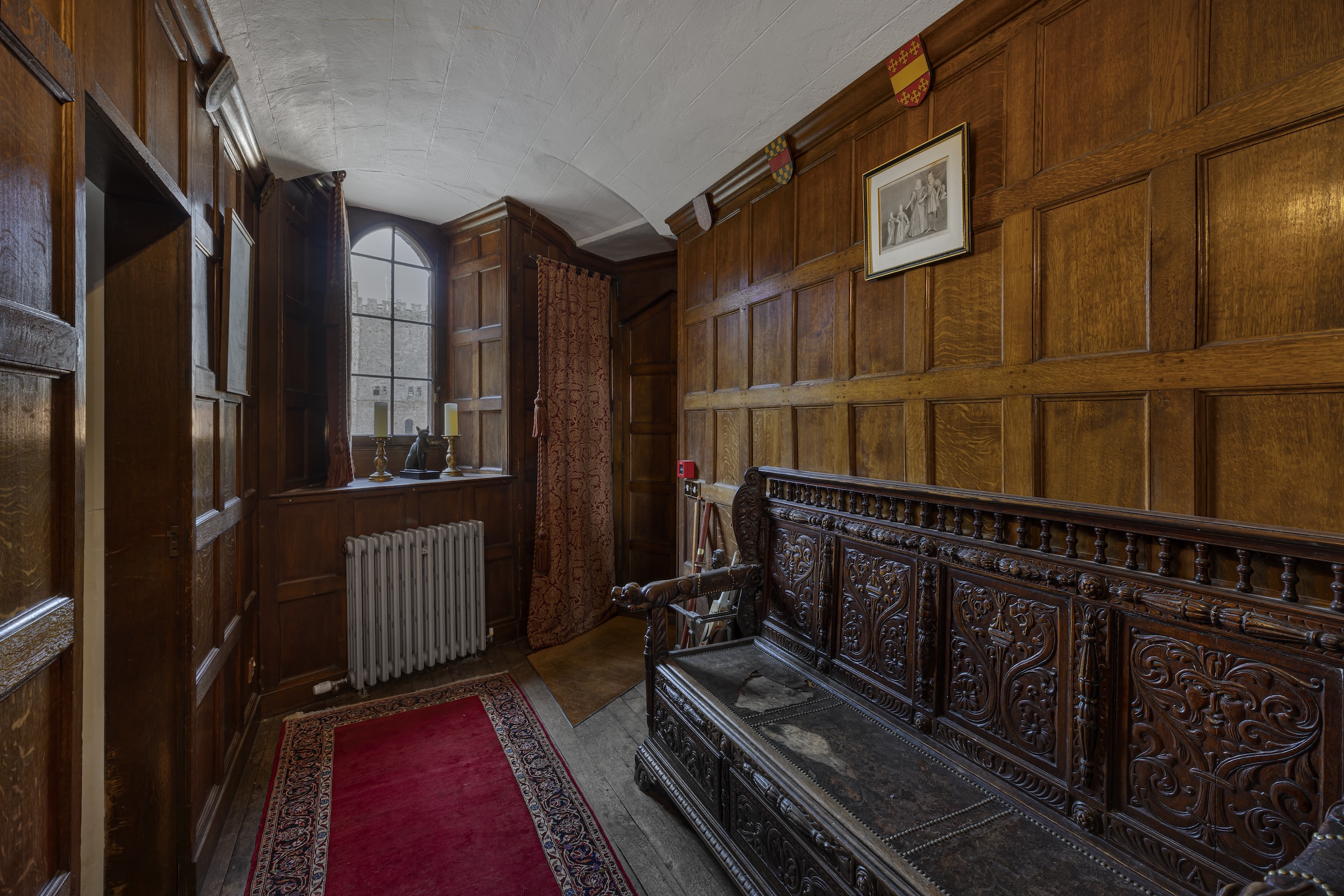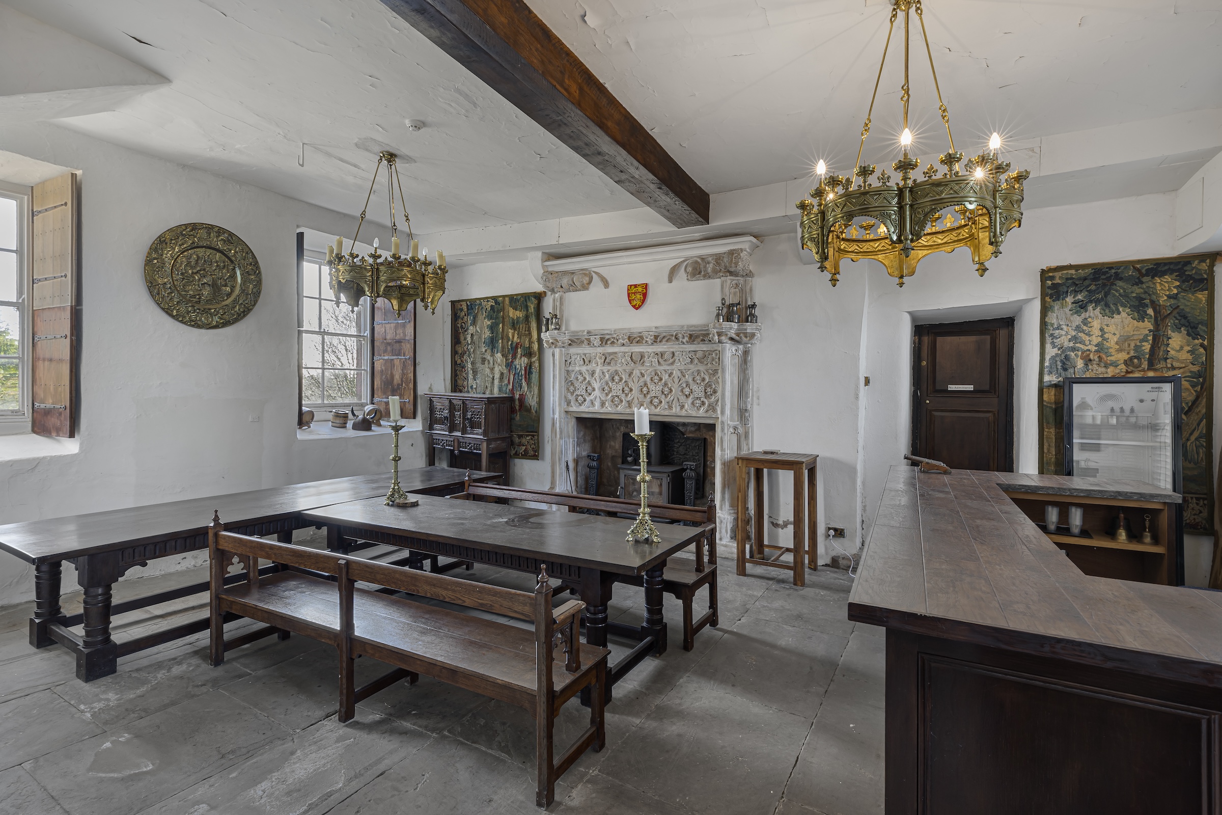 Ascending to the first floor, a utility room with a medieval garderobe complements a luxurious sitting room, known as Lady Anne's reading room since its addition in 1454. Nearby, a private dining room is perfect for entertaining.