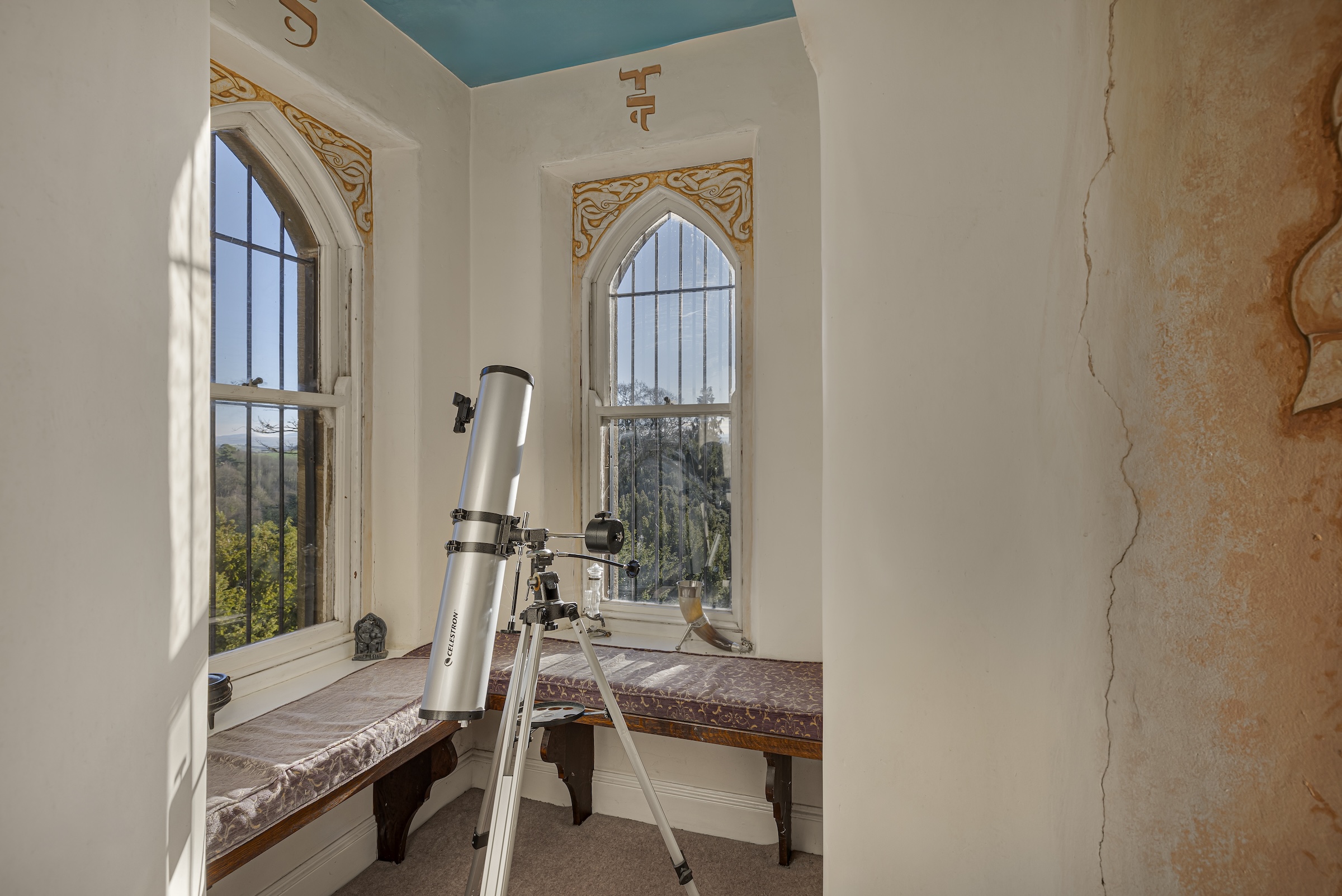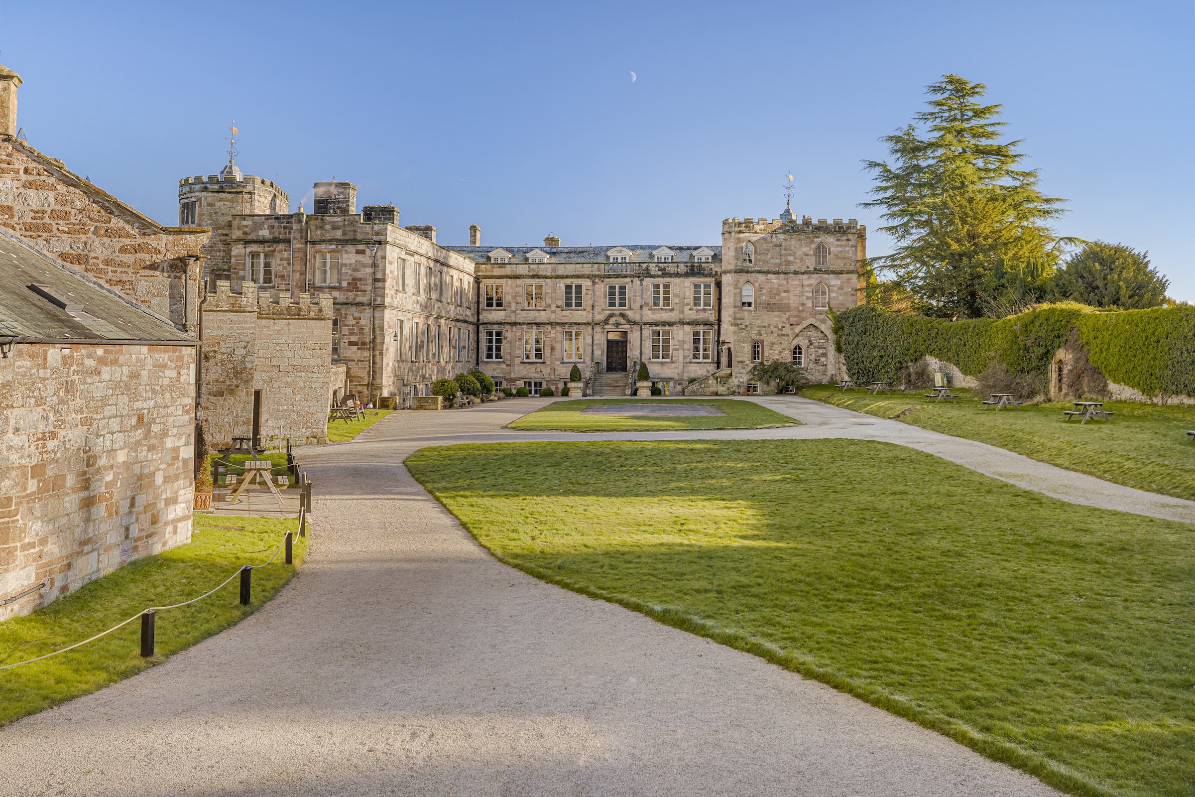 On the second floor, Lady Anne Clifford's bedroom offers panoramic views of the restored Norman Keep, alongside two other spacious bedrooms and a bathroom, with a hidden room beneath one of them.