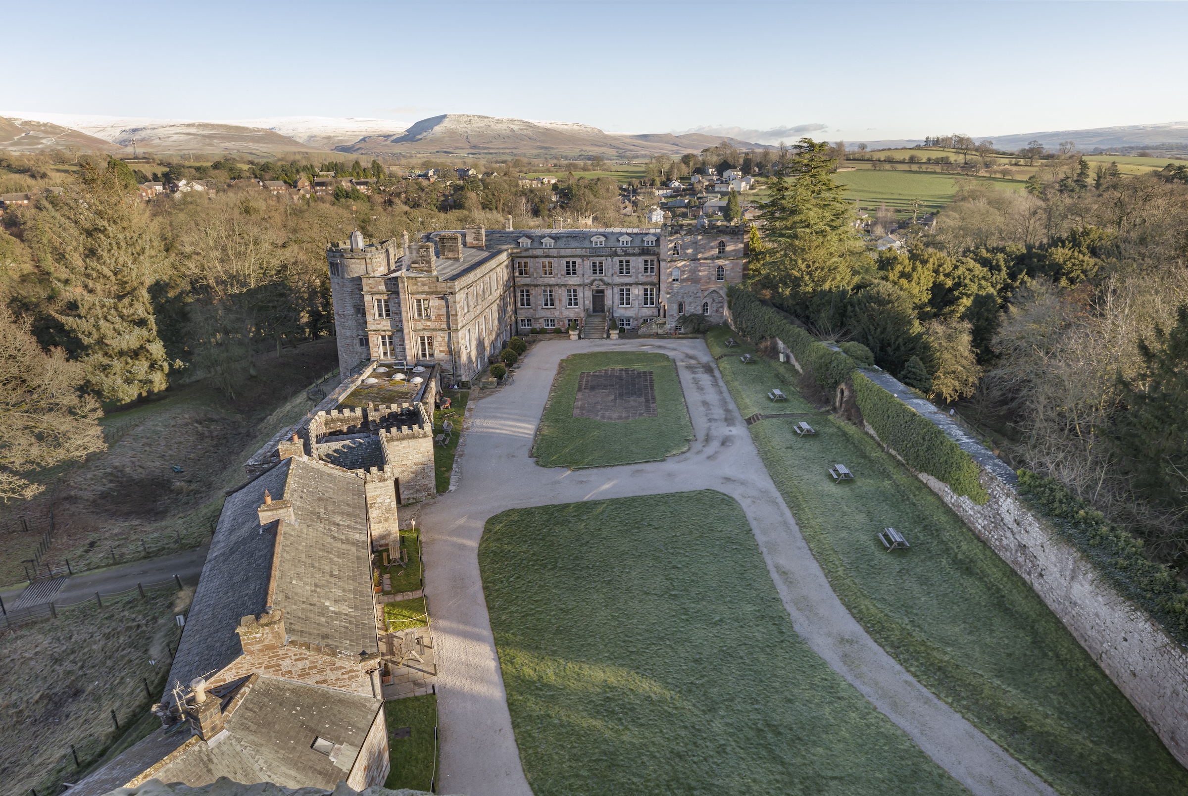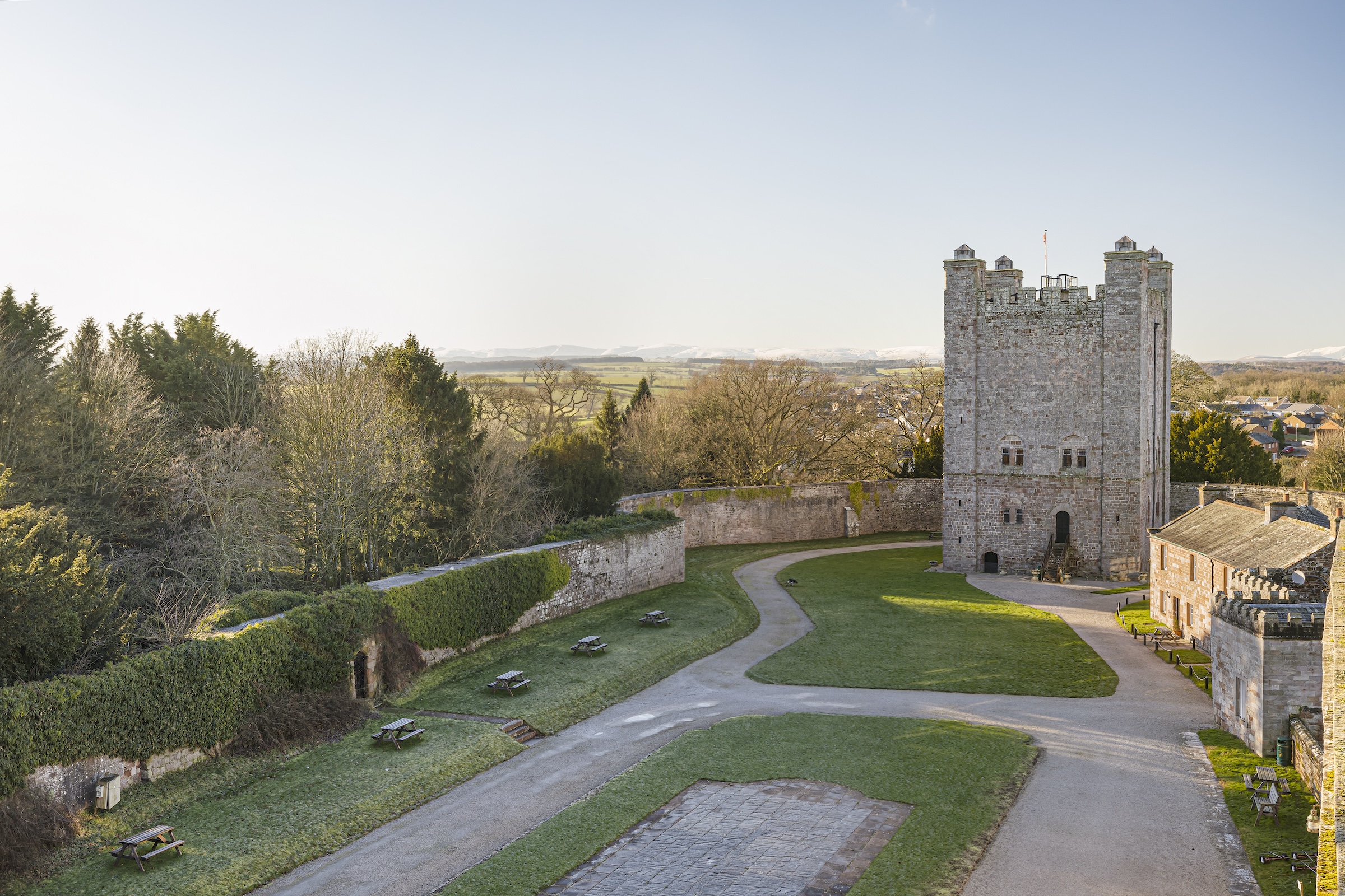 The castle is set at the upper reaches of Boroughgate in Appleby, in the Eden Valley at the edge of the Lake District. One of the UK's most historic castles, the Grade I-listed building features sandstone walls beneath a pitched slate and lead roof. The 12th-century motte and bailey castle also has a Norman keep and a 13th-century round tower.