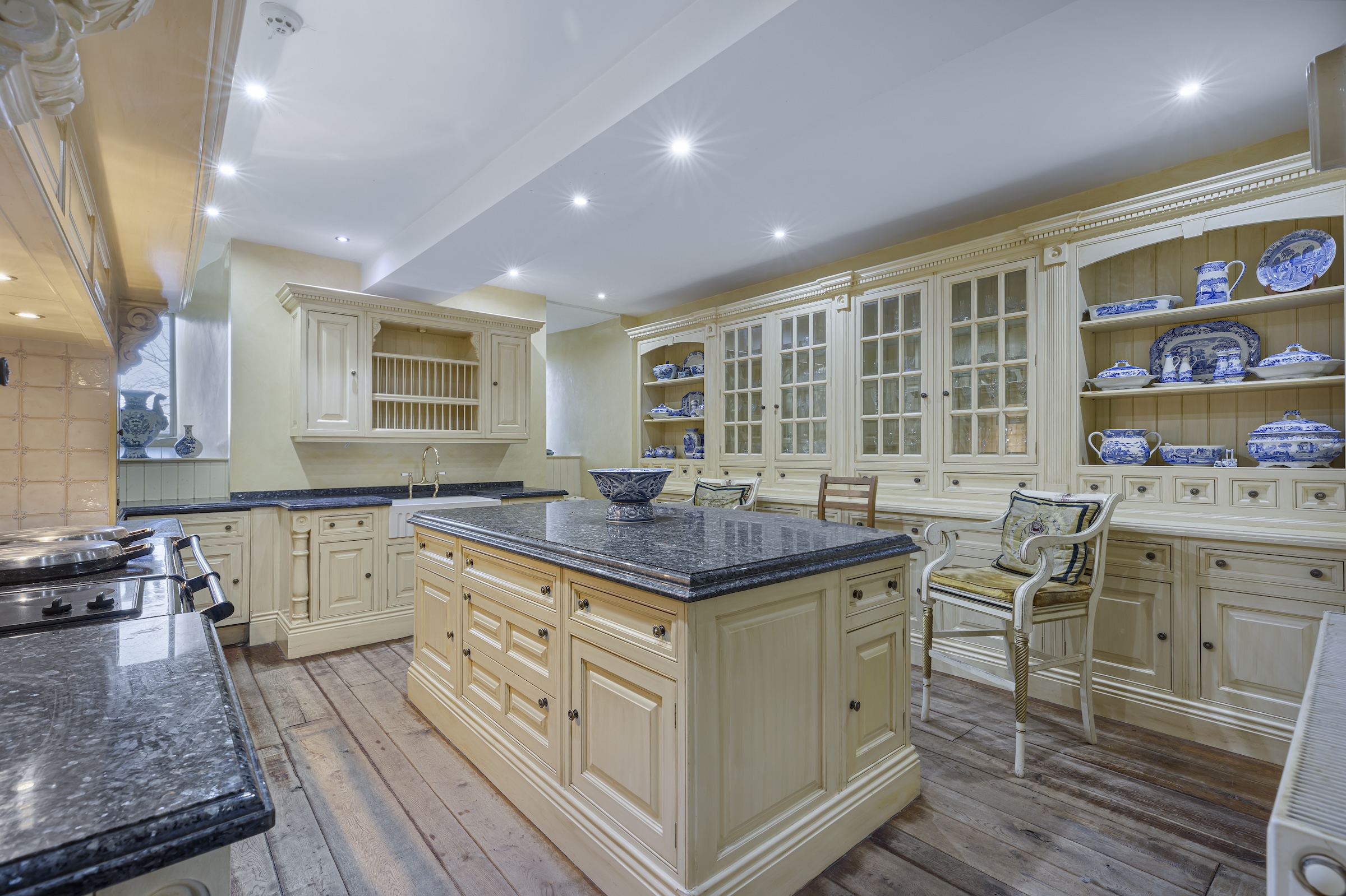 The ground floor features a medieval dining room converted to stone in 1180. Adjacent to it, a magnificent Clive Christian Kitchen blends modern luxury with historic features.