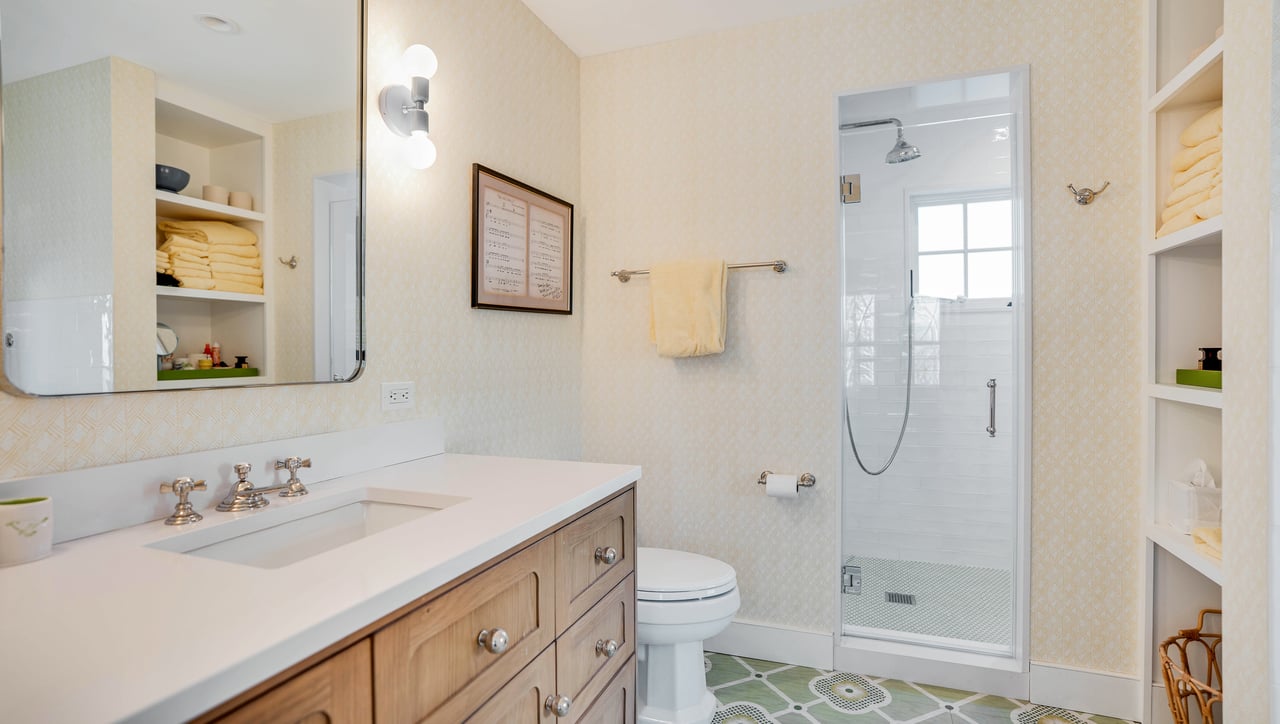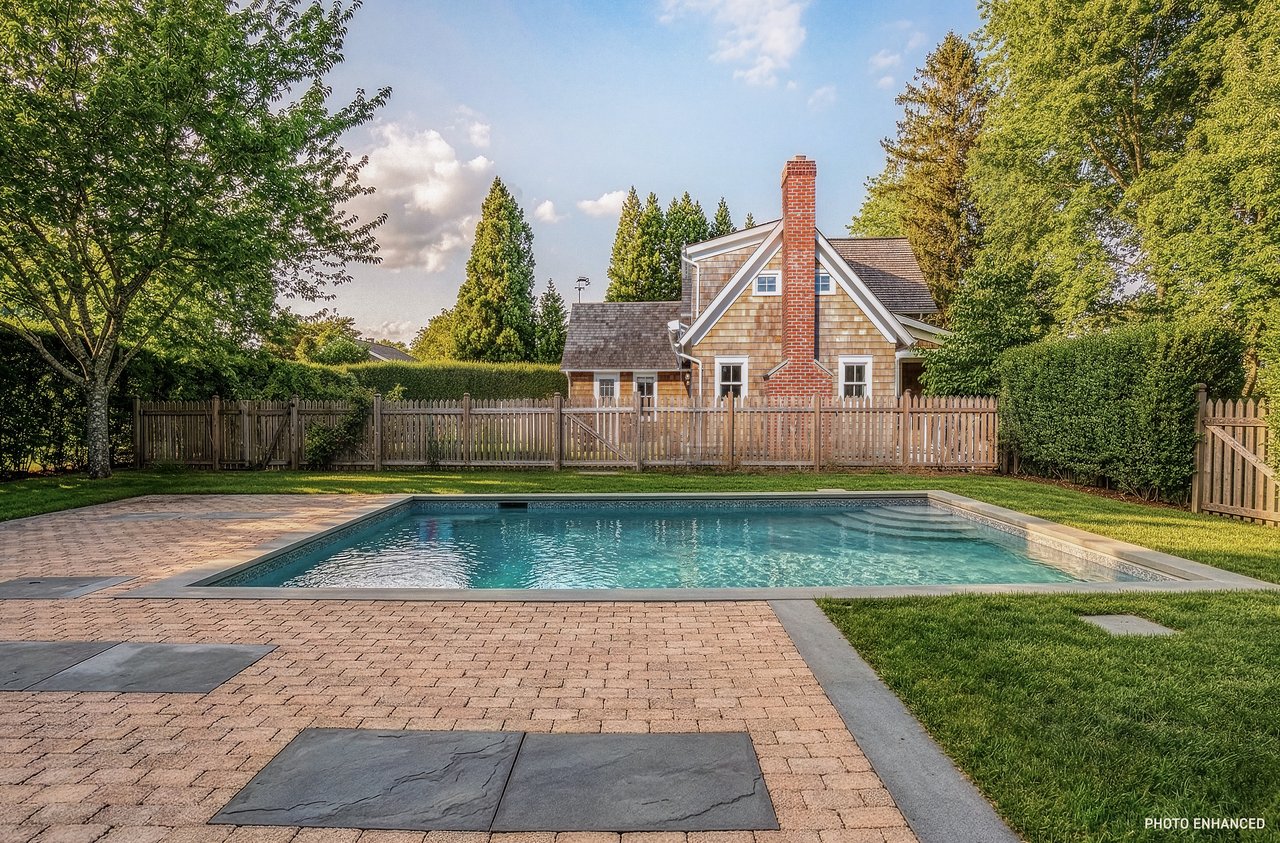 On a quaint lane south of the highway in Bridgehampton, minutes to ocean beaches and an easy jaunt to the charms of Main Street, this exceedingly stylish and beautifully renovated circa 1850 shingled traditional with exceptional outdoor spaces including a heated, gunite pool and built-in grill kitchen, is offered to rent for the first time.