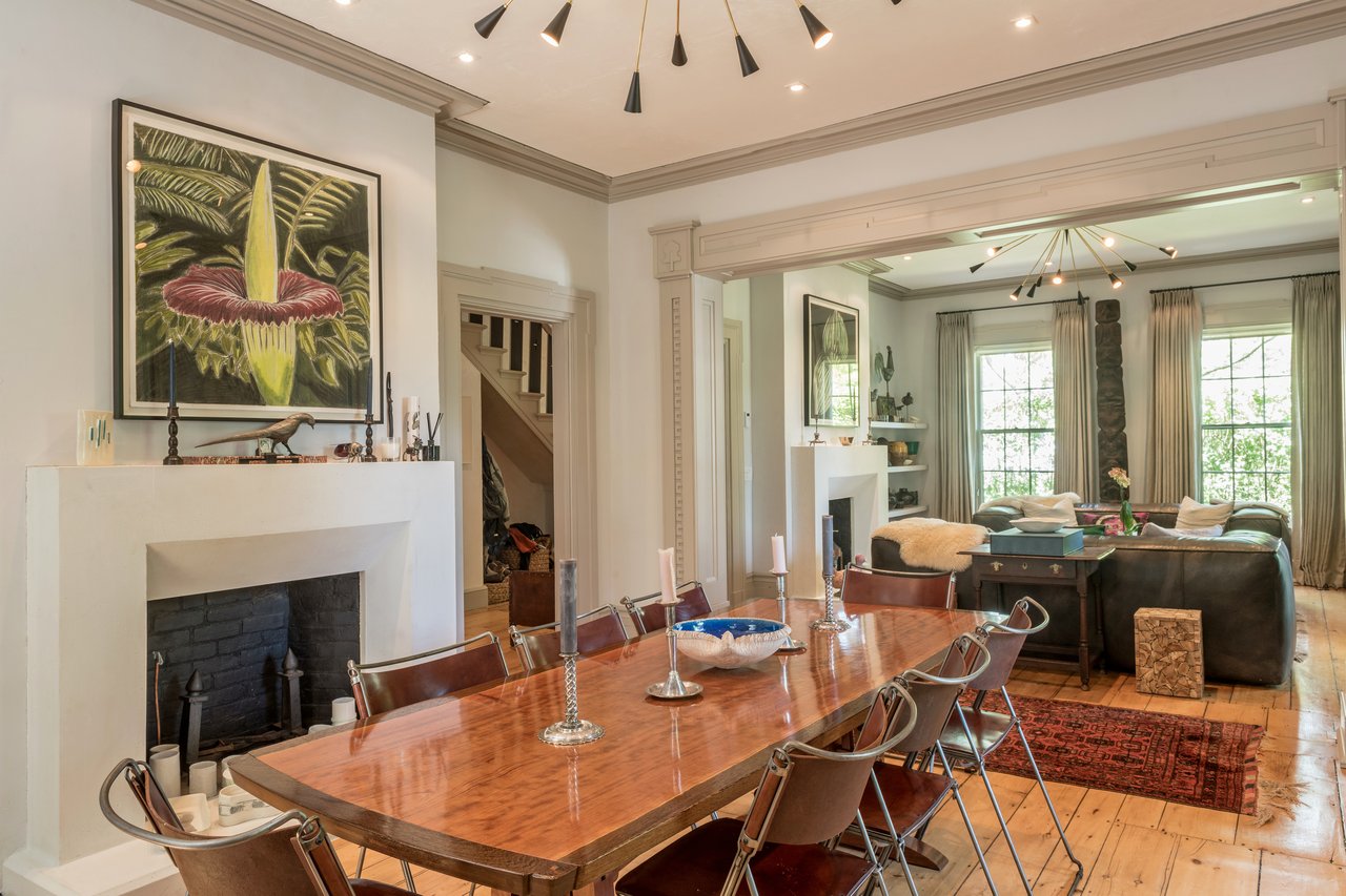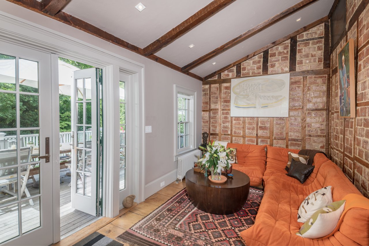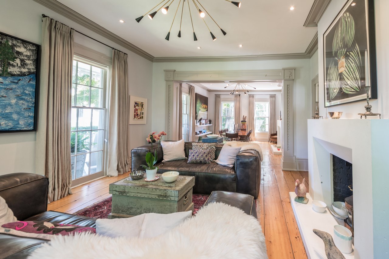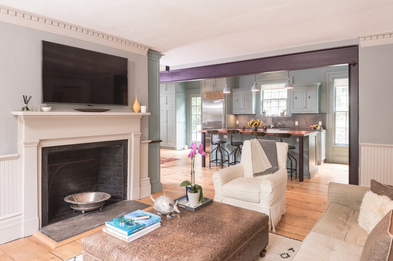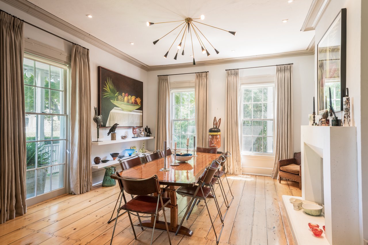 Dating to circa 1765, with walls originally constructed from the ballasts of ships, and sympathetically modernized in 2012, this graceful 4-bedroom former manse of the Old Whaler's Church offers impeccable style and irreplaceable character at a coveted address in the heart of Sag Harbor Village. Period architectural details in the Egyptian Revival style with a whaling motif, matching that of the church, remain beautifully preserved from an addition in the mid 1800s by Minard Lafever, designer of the iconic Old Whaler's Church. The home opens on a grand 50' hallway of brick, waxed, Venetian plaster, dentil molding, and the original wide plank, pumpkin pine floors. The living room and dining room, each adorned with fireplaces and Lafever's authentic moldings, flank the entry and profit from the natural light of nearly full height windows which open to the charming front porch. The entry hallway leads to the spacious and supremely stylish eat-in kitchen with bay window breakfast nook, island seating, and custom cabinetry by Dereyk Patterson, crowned by a handmade La Cornue Chateau range in Lafayette Blue. The open kitchen flows into a sitting room with fireplace. A second sitting room with French doors opens onto the elevated, rear dining deck, overlooking the heated, gunite, 30' lap pool and outdoor shower, all screened by mature hedges and landscaping. An en suite guest bedroom and powder bath complete the main level. Upstairs, the bright master suite offers walk-in closets and a luxurious Moroccan tile bath with dual vanity, free standing tub, and shower. A bright office off the landing and two en suite bedrooms complement the master. The third floor has a cedar room and storage space. The partially finished lower level has a sitting room with the original kitchen's oven, full bath, laundry room, and wine room. Central vacuum system and radiant heating in select rooms. Convenient to all the charms of Sag Harbor Village, this is a rare opportunity to own a fully renovated, trophy home of exceptional character and design.