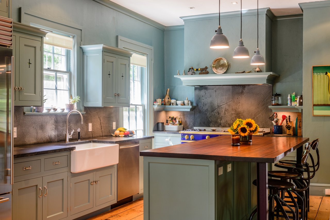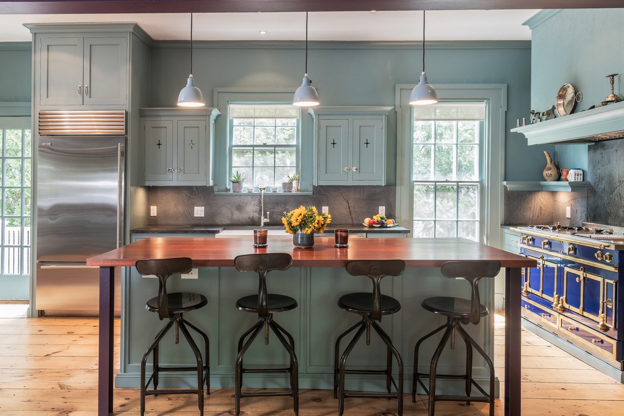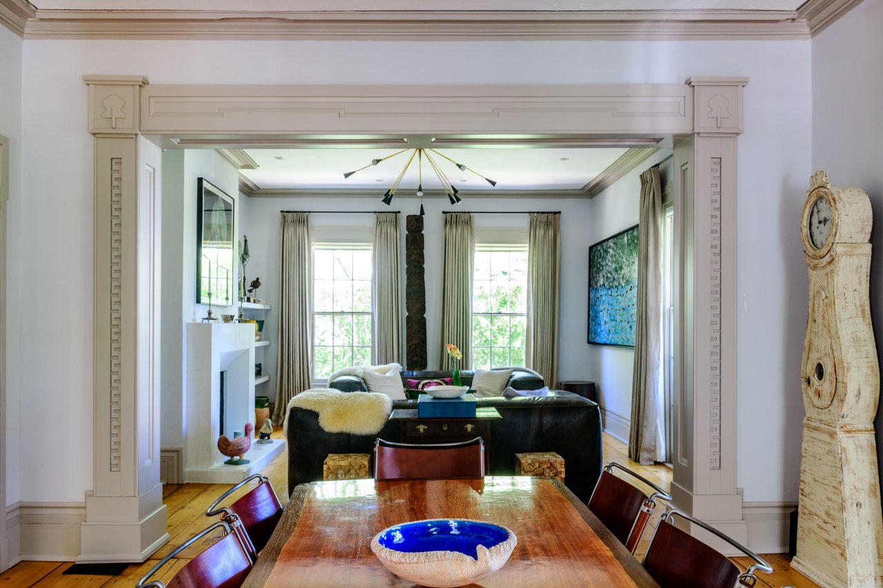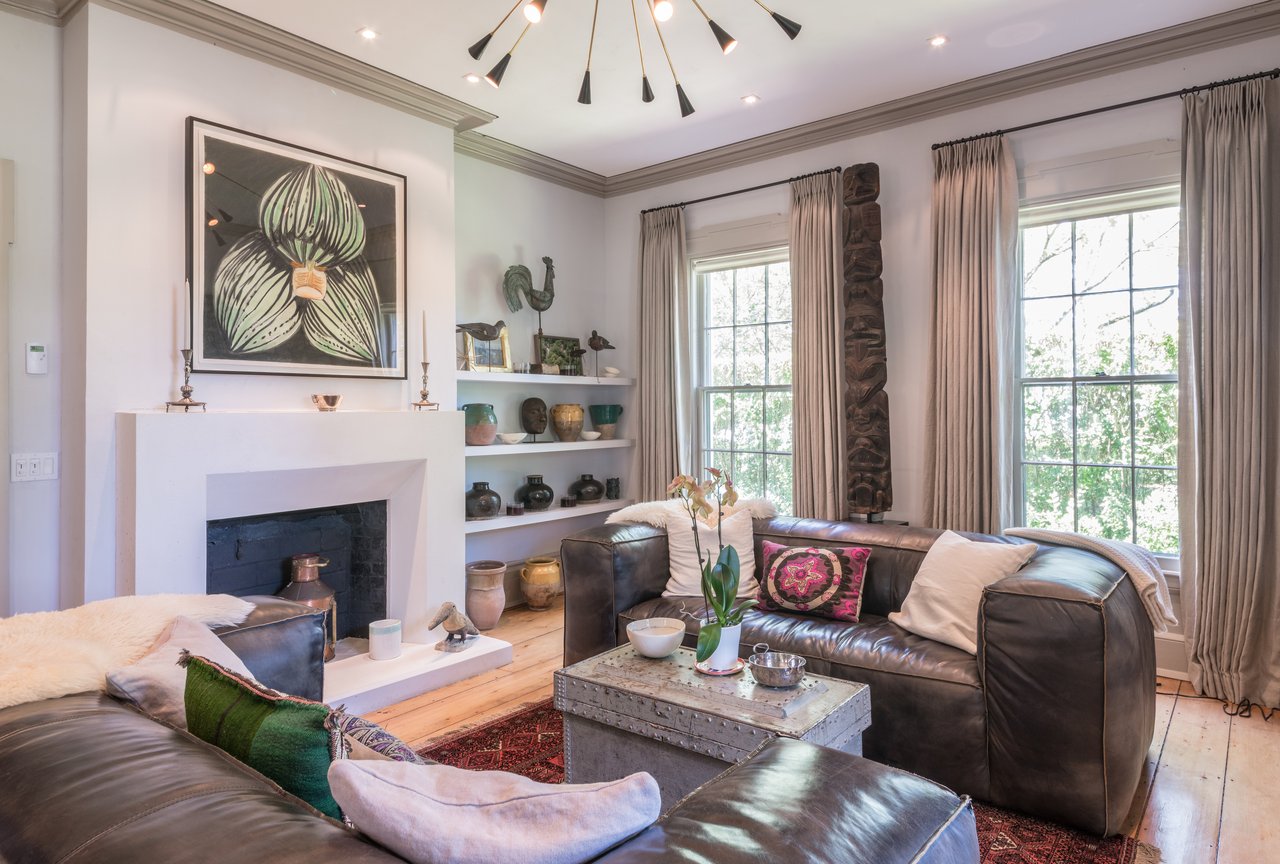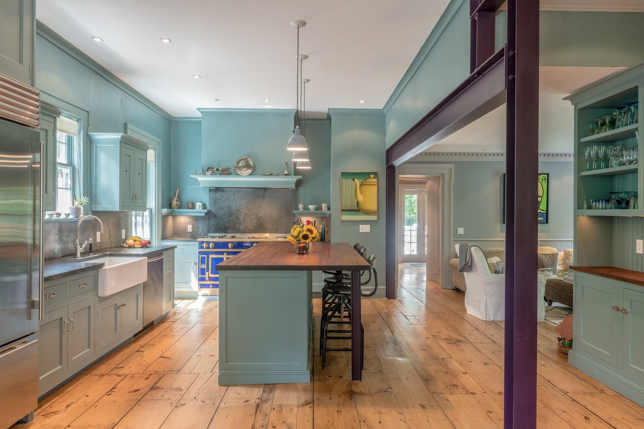 Dating to circa 1765, with walls originally constructed from the ballasts of ships, and sympathetically modernized in 2012, this graceful 4-bedroom former manse of the Old Whaler's Church offers impeccable style and irreplaceable character at a coveted address in the heart of Sag Harbor Village. Period architectural details in the Egyptian Revival style with a whaling motif, matching that of the church, remain beautifully preserved from an addition in the mid 1800s by Minard Lafever, designer of the iconic Old Whaler's Church. The home opens on a grand 50' hallway of brick, waxed, Venetian plaster, dentil molding, and the original wide plank, pumpkin pine floors. The living room and dining room, each adorned with fireplaces and Lafever's authentic moldings, flank the entry and profit from the natural light of nearly full height windows which open to the charming front porch. The entry hallway leads to the spacious and supremely stylish eat-in kitchen with bay window breakfast nook, island seating, and custom cabinetry by Dereyk Patterson, crowned by a handmade La Cornue Chateau range in Lafayette Blue. The open kitchen flows into a sitting room with fireplace. A second sitting room with French doors opens onto the elevated, rear dining deck, overlooking the heated, gunite, 30' lap pool and outdoor shower, all screened by mature hedges and landscaping. An en suite guest bedroom and powder bath complete the main level. Upstairs, the bright master suite offers walk-in closets and a luxurious Moroccan tile bath with dual vanity, free standing tub, and shower. A bright office off the landing and two en suite bedrooms complement the master. The third floor has a cedar room and storage space. The partially finished lower level has a sitting room with the original kitchen's oven, full bath, laundry room, and wine room. Central vacuum system and radiant heating in select rooms. Convenient to all the charms of Sag Harbor Village, this is a rare opportunity to own a fully renovated, trophy home of exceptional character and design.