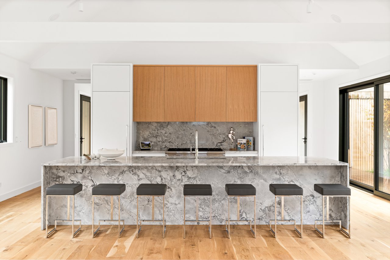 An oversized glass pivot door opens on the entry foyer, awash with light from frameless skylights above, which highlights the lovely texture of the European-style 8-inch white oak floors used throughout. The airy great room with vaulted 18-foot ceilings and exposed pinned-rafters houses the gourmet, eat-in kitchen with island seating, dining area, living room with linear gas-burning fireplace, and an exceptionally well-appointed prep kitchen. The elevated kitchen has custom frameless and handleless cabinetry by Mark Frappied Design, Superwhite Quartzite countertops with a waterfall island, and top of the line appliances by Thermador.