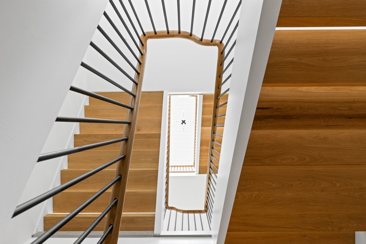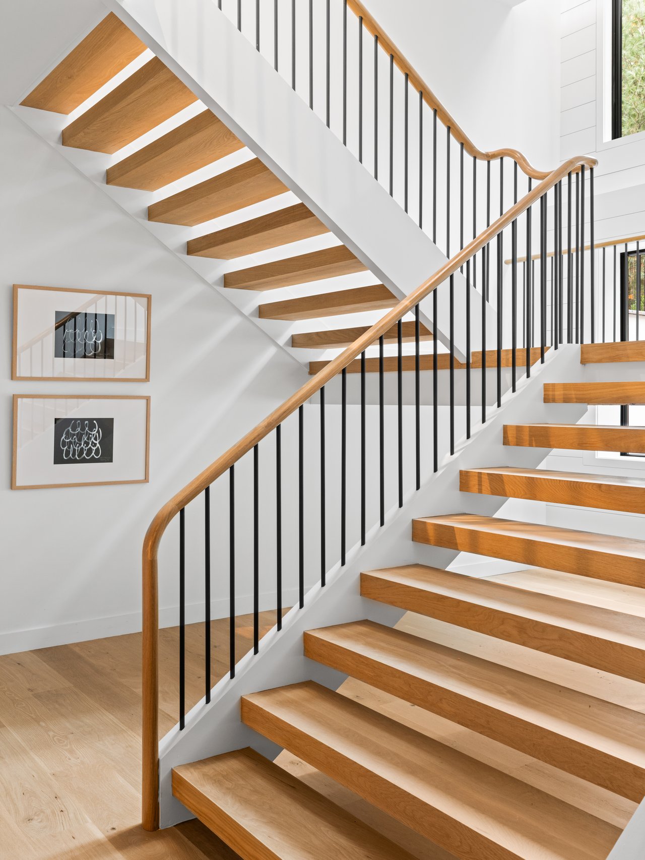 Clad in custom milled 24-inch Alaskan yellow cedar “Royal” shingles that weather silver with age and accented with impeccable vertical cedar slats, standing seam metal, and black aluminum finishes, stunning details inside and out characterize this modern interpretation of a twin-gabled barn. The perpendicular wings of the home allow for abundant natural light from ample fenestration which frame gorgeous landscape vignettes ranging from specimen European hornbeams, crepe myrtles, and limelight hydrangeas to creeping red fescue meadows to the original pine, oak, and American holly trees ringing the property, all curated by The Timeless Gardener.