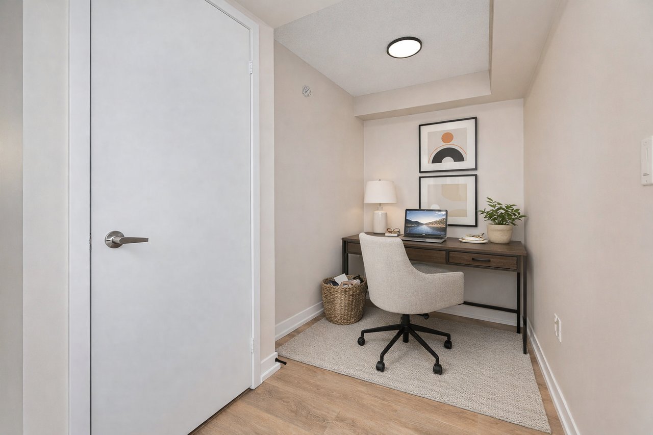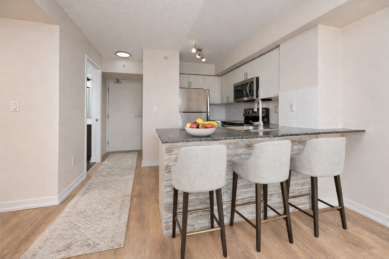 This spacious and well-designed 1+1 bedroom suite offers the perfect blend of comfort and convenience. Featuring a gourmet kitchen complete with a breakfast bar, fresh paint throughout, and tasteful upgrades, this bright and inviting unit is move-in ready. Enjoy a functional layout with a versatile den-ideal for a home office or guest space-a full 4-piece bathroom, and a sun-filled living room with west exposure that walks out to a private balcony, perfect for relaxing or entertaining.